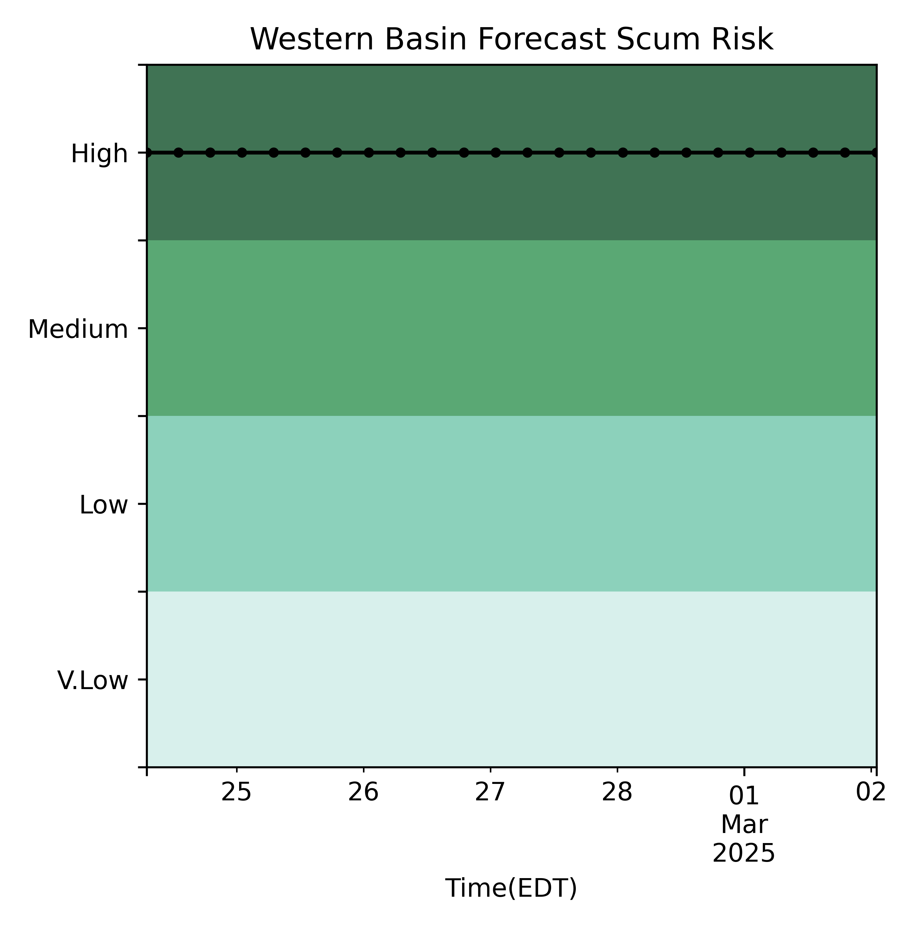 Forecast of the potential for mixing over at least the next 96 hours, to determine whether the majority of the bloom is at the surface,subsurface, or mixed throughout the water column. Grey coloring indicates the absence of chlorophyll or area with no data. Each point represents a location used by the bloom forecast. Click a point to visualize bloom depth in the water column by date and modeled concentration. Last Updated:2025-11-08